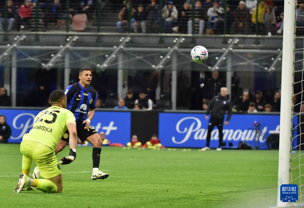 4月1日,国际米兰队球员桑切斯(右)在比赛中射门得分。新华社发(阿尔贝托·林格利亚摄)
