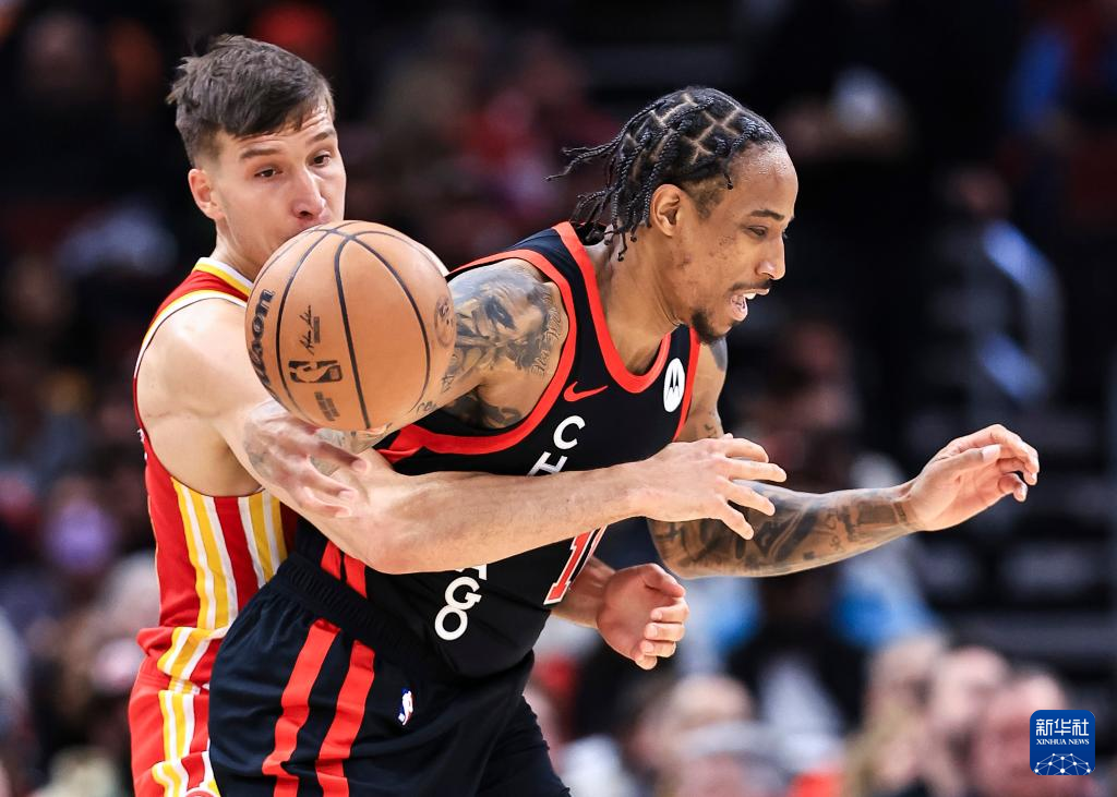4月1日,老鹰队球员博格达诺维奇(左)与公牛队球员德罗赞在比赛中拼抢。新华社发(乔尔·莱纳摄)