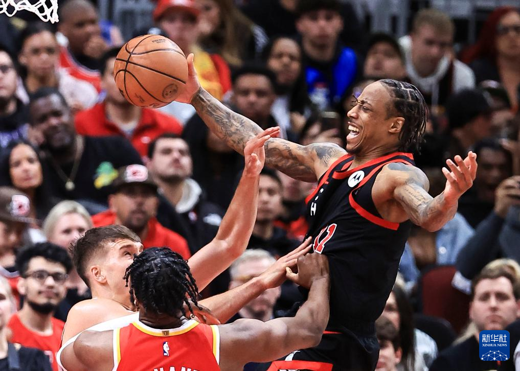 4月1日,公牛队球员德罗赞(右上)在比赛中争抢。新华社发(乔尔·莱纳摄)