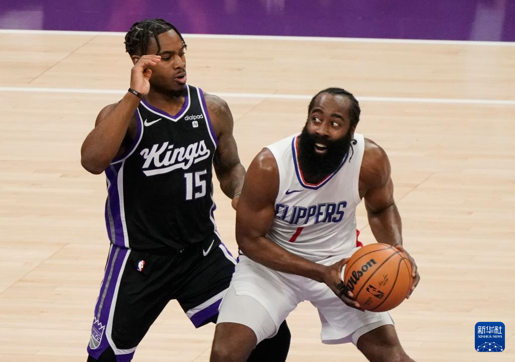 4月2日,快船队球员哈登(右)与国王队球员达维昂·米切尔在比赛中拼抢。新华社发(李建国摄)