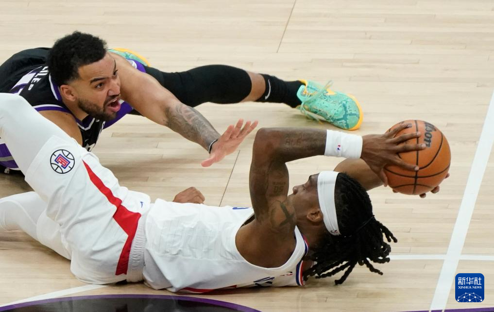 4月2日,快船队球员特伦斯·曼恩(下)与国王队球员特雷·莱尔斯在比赛中拼抢。新华社发(李建国摄)