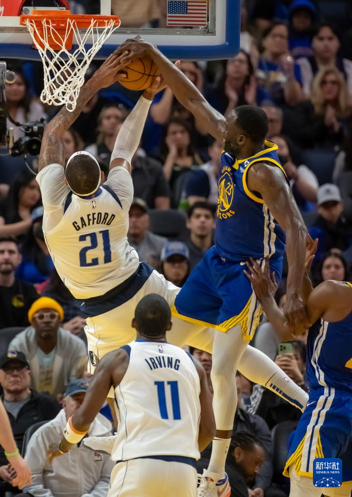 4月2日,独行侠队球员丹尼尔·加福德(左)在比赛中防守勇士队球员德雷蒙德·格林。新华社发(董旭东摄)