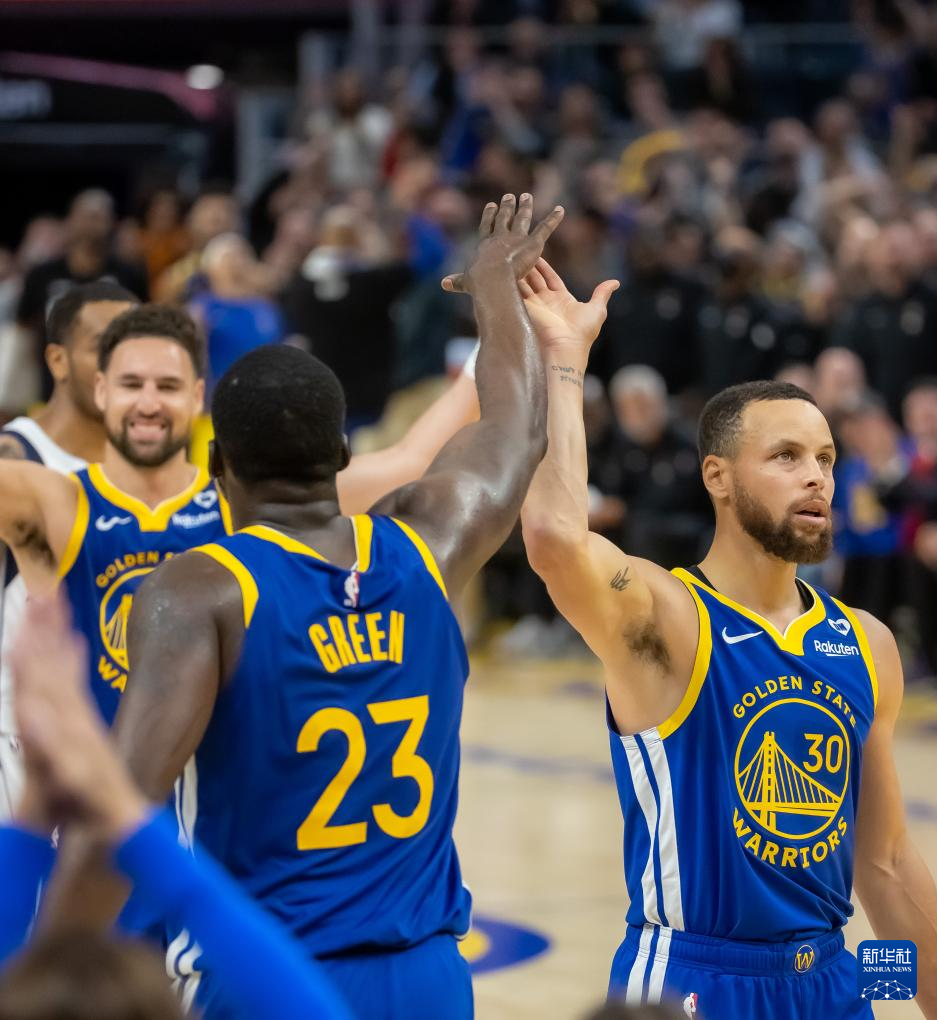 4月2日,勇士队球员库里(右)在比赛中与队友庆祝。新华社发(董旭东摄)