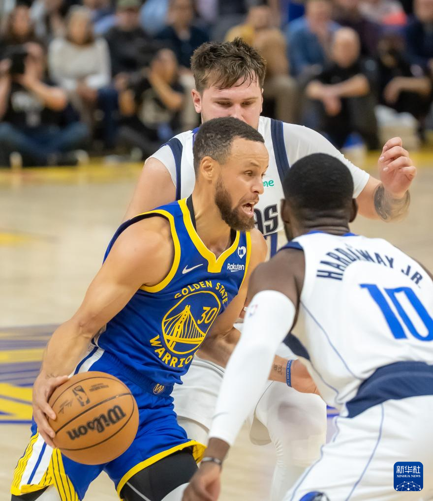 4月2日,勇士队球员库里(中)在比赛中进攻。新华社发(董旭东摄)