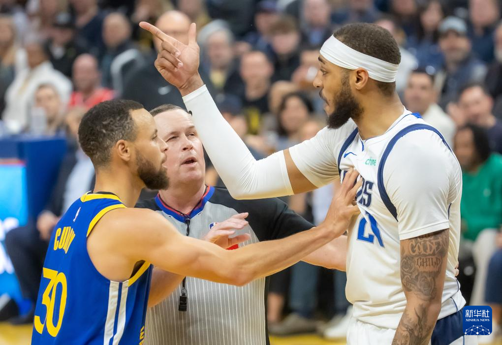4月2日,独行侠队球员丹尼尔·加福德(右)与勇士队球员库里在比赛中发生争执。新华社发(董旭东摄)