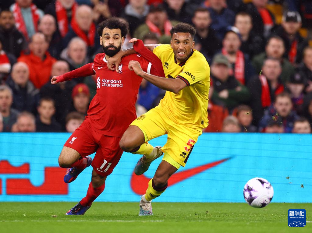 4月4日,利物浦队球员萨拉赫(左)与谢菲尔德联队球员特拉斯蒂拼抢。新华社/路透