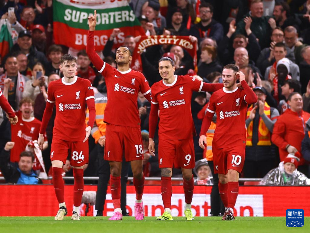 4月4日,利物浦队球员加克波(左二)和队友庆祝进球。新华社/路透