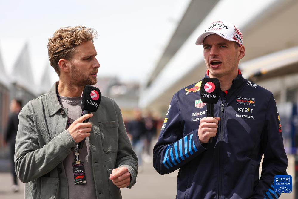 4月4日,红牛车队荷兰车手维斯塔潘(右)在围场接受媒体采访。新华社发(钱俊摄)