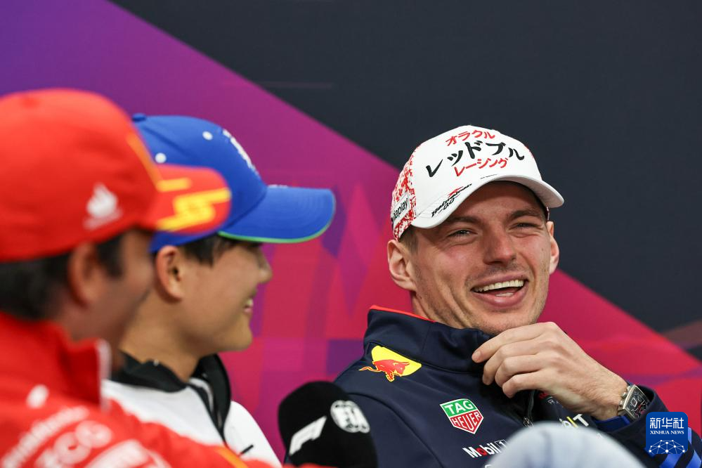 4月4日,红牛车队荷兰车手维斯塔潘(右)在赛前的记者发布会上。新华社发(钱俊摄)