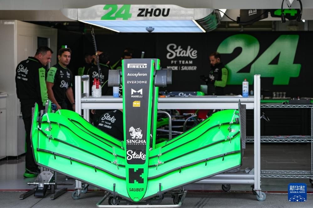 这是4月4日在索伯车队车库拍摄的周冠宇赛车的前翼。新华社记者 张笑宇 摄
