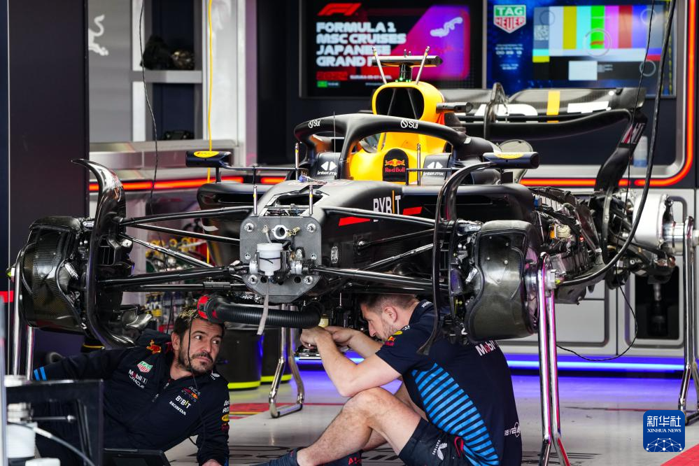 4月4日,红牛车队技师在车库检修荷兰车手维斯塔潘的赛车。新华社记者 张笑宇 摄