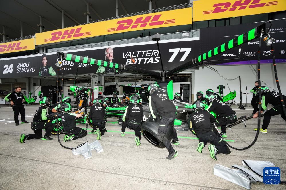 4月4日,索伯车队维修人员在练习换胎。新华社记者 张笑宇 摄