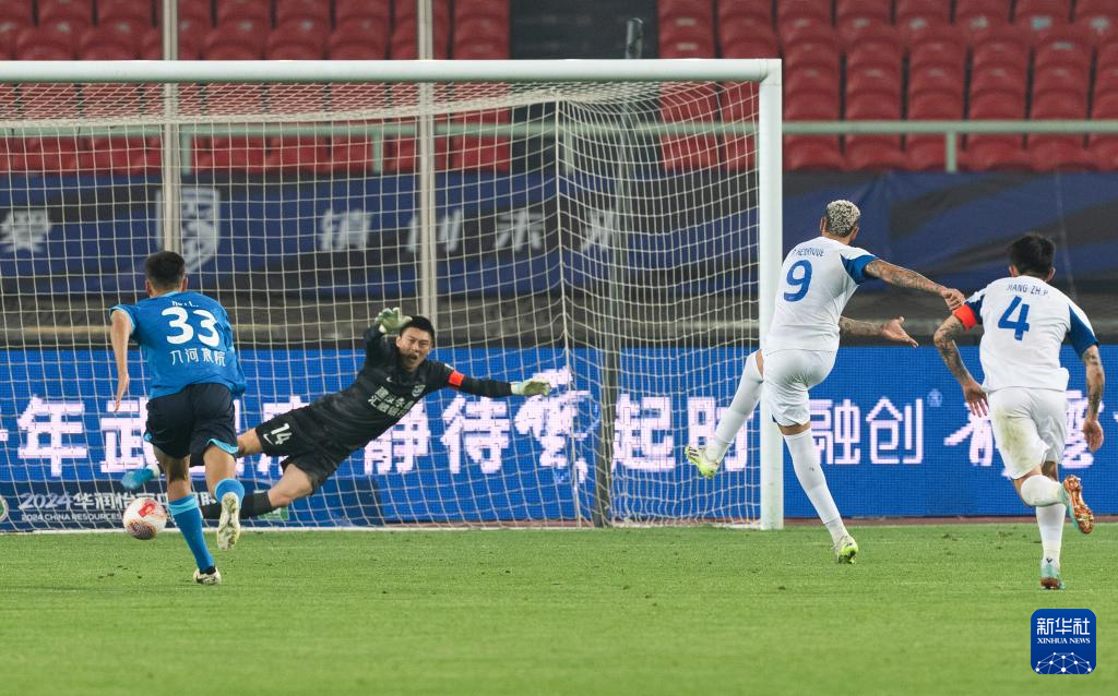 4月4日,武汉三镇队球员恩里克(右二)在比赛中点球破门。新华社记者 肖艺九 摄