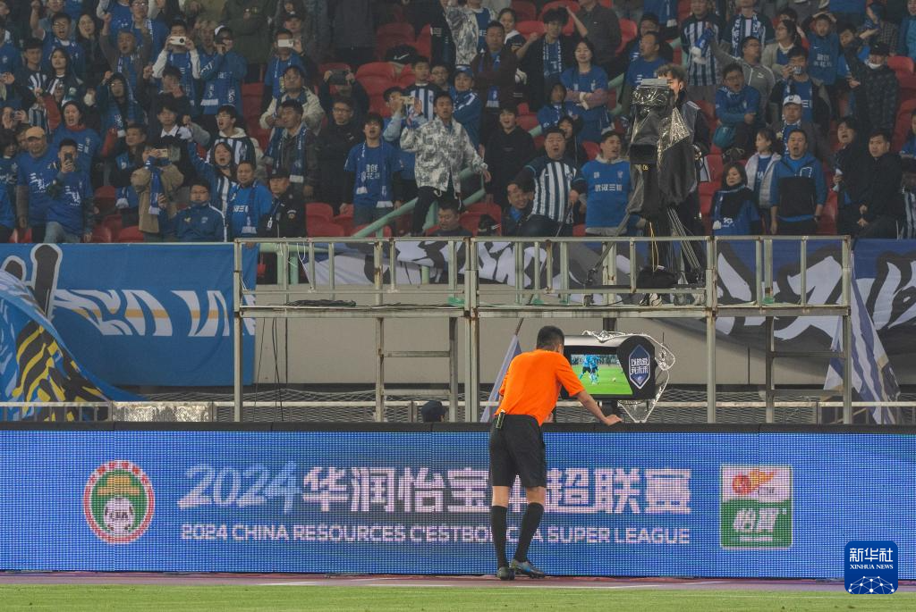 4月4日,主裁判高鹏在比赛中查看视频回放。新华社记者 肖艺九 摄