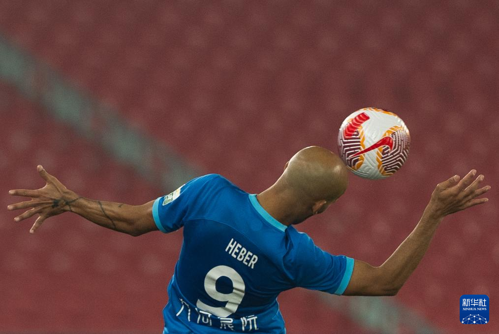 4月4日,沧州雄狮队球员埃韦尔在比赛中争顶。新华社记者 肖艺九 摄