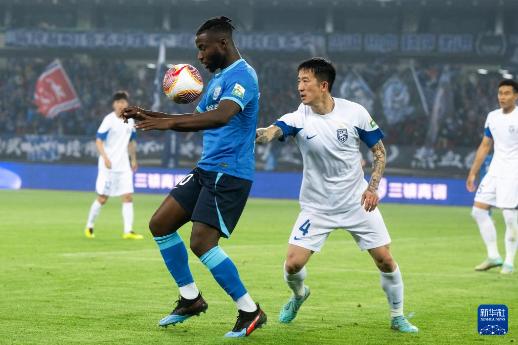 4月4日,沧州雄狮队球员奥斯卡(左)在比赛中停球。新华社记者 肖艺九 摄