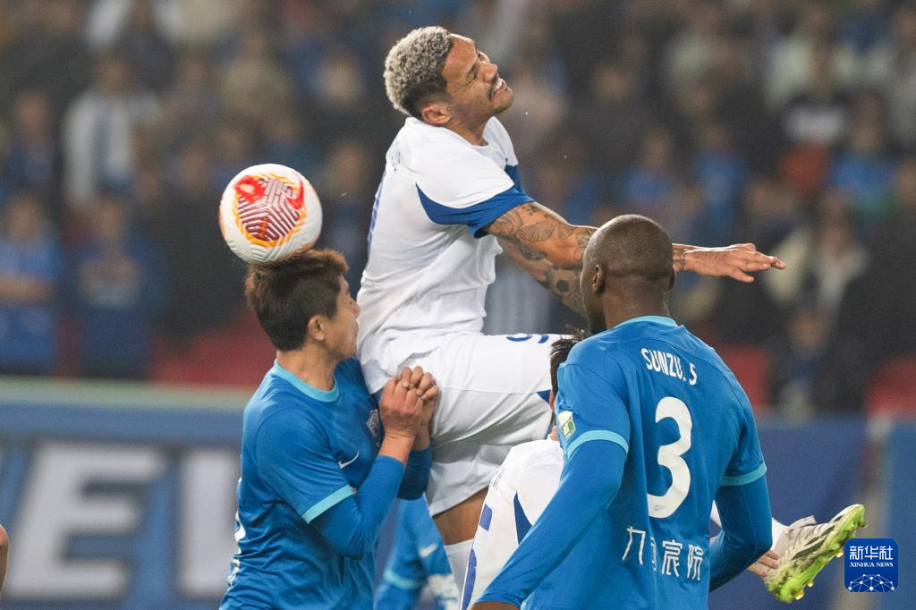 4月4日,武汉三镇队球员恩里克(中)在比赛中争顶。新华社记者 肖艺九 摄