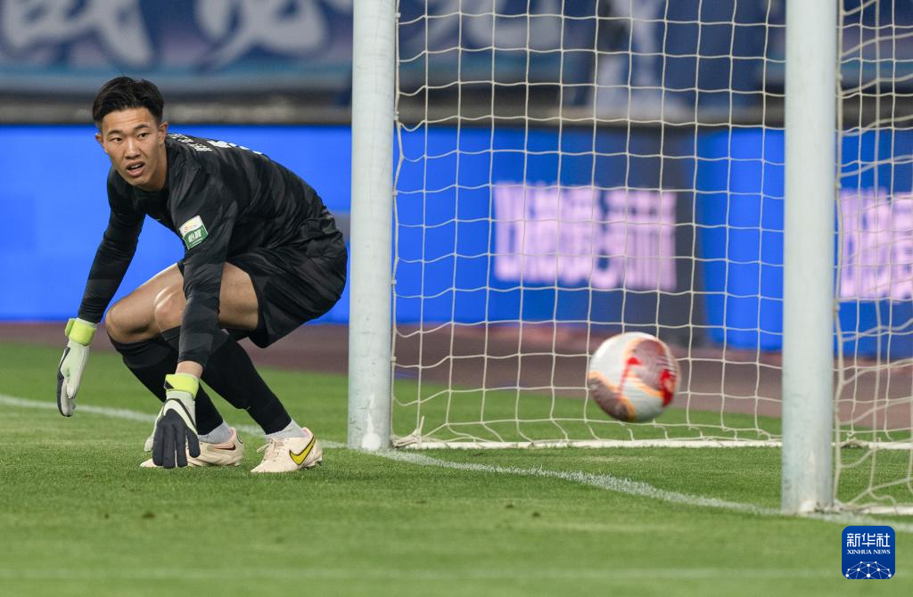 4月4日,武汉三镇队守门员魏黾哲在比赛中扑救失败。新华社记者 肖艺九 摄
