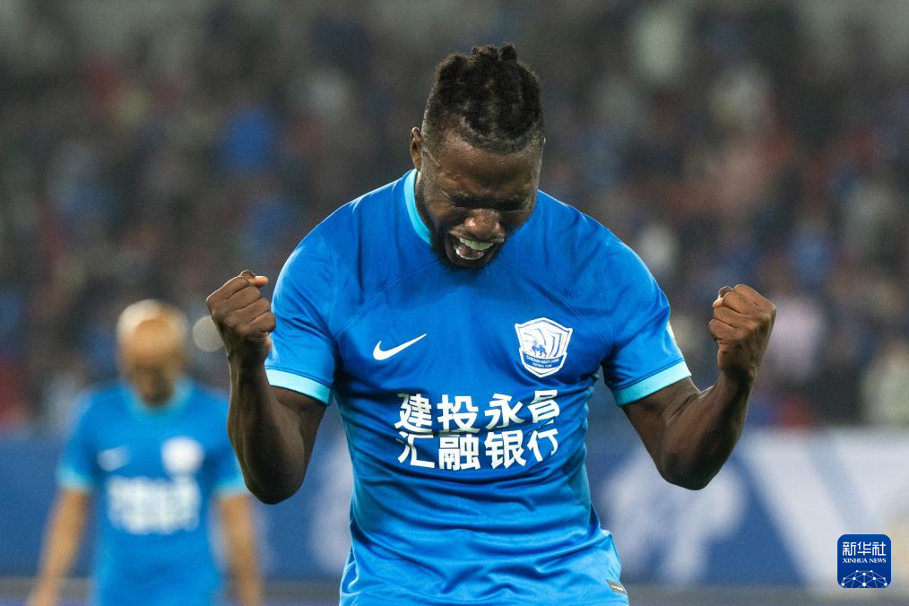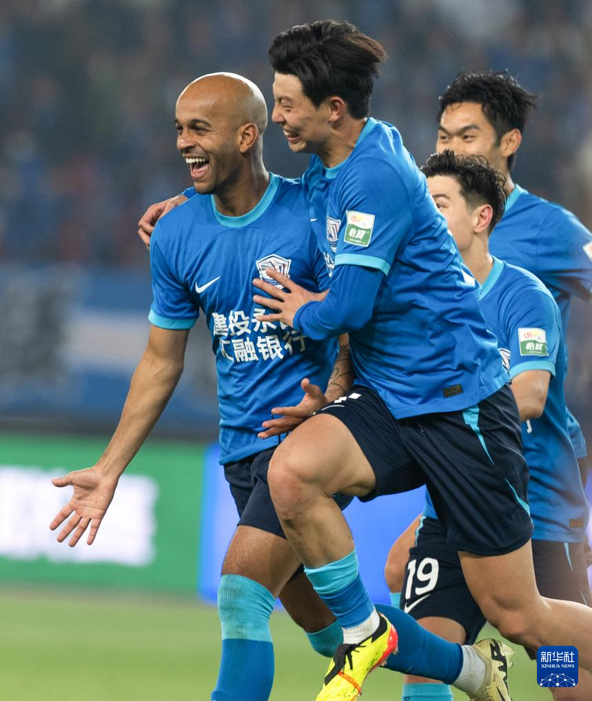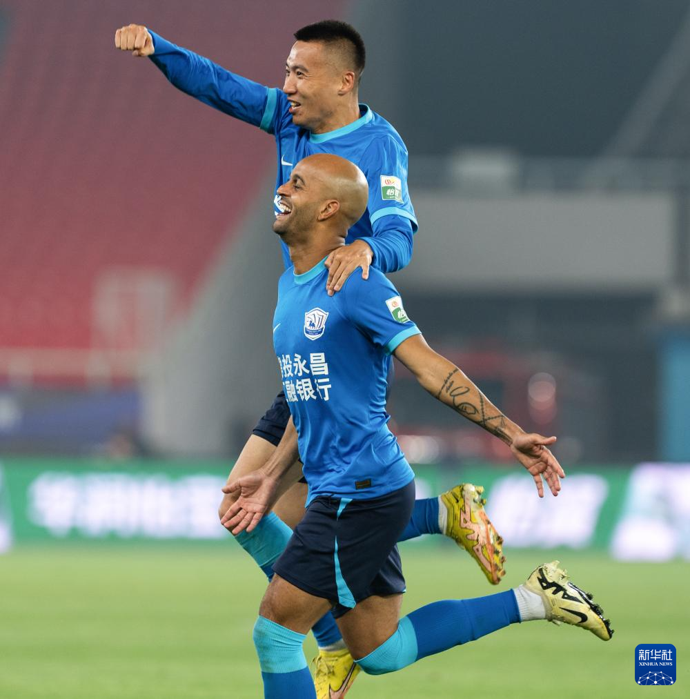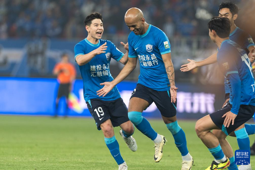 4月4日,沧州雄狮队球员埃韦尔(前)进球后与队友庆祝。新华社记者 肖艺九 摄