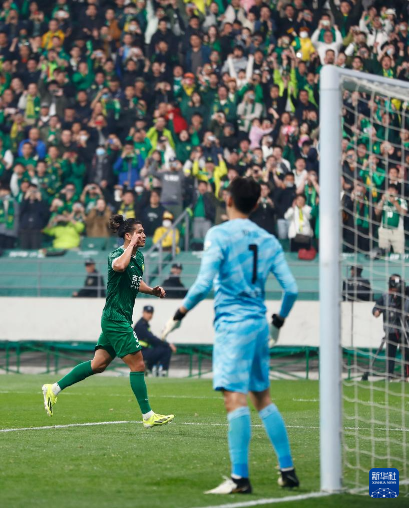 4月5日,北京国安队球员张玉宁在比赛中主罚点球得分后庆祝。新华社记者 贾浩成 摄