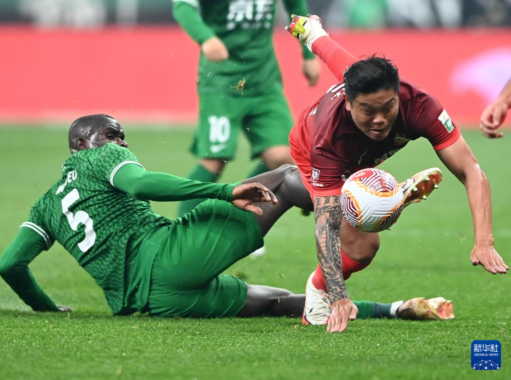 4月5日,北京国安队球员恩加德乌(左)和上海海港队球员蔡慧康在比赛中拼抢。新华社记者 赵子硕 摄