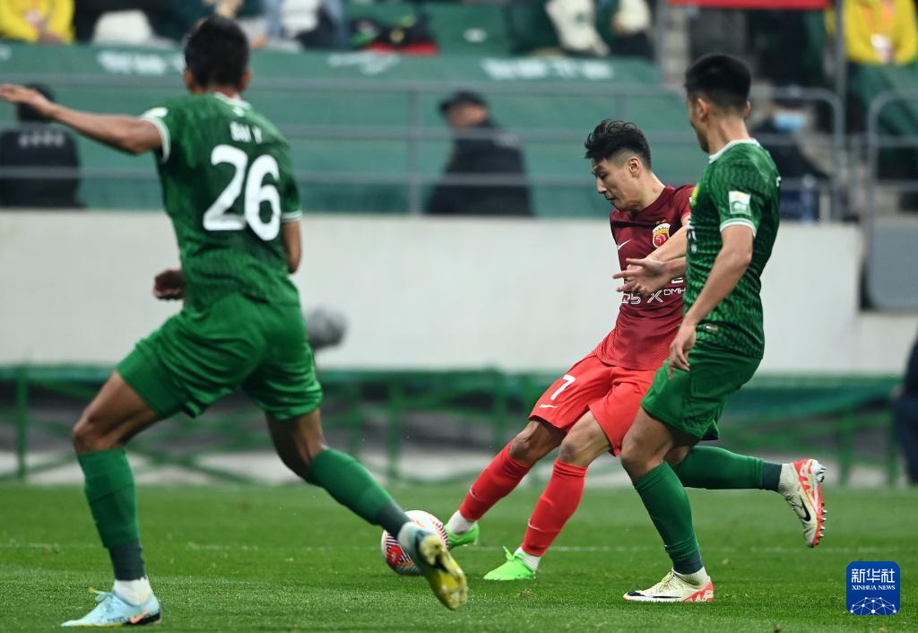 4月5日,上海海港队球员武磊(中)在比赛中射门。新华社记者 赵子硕 摄