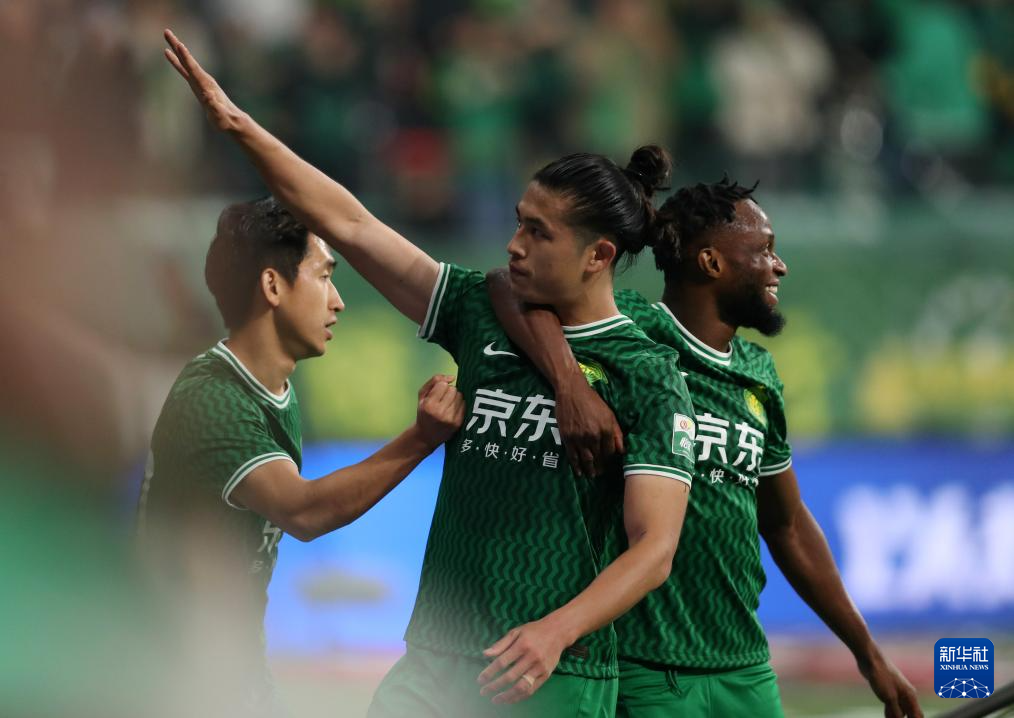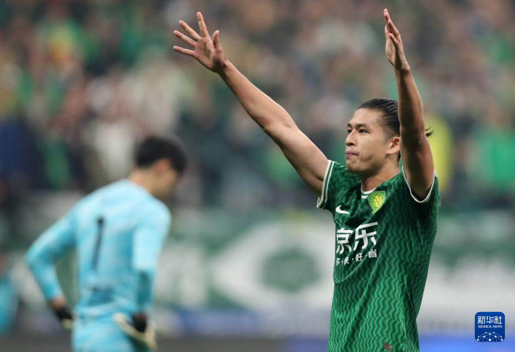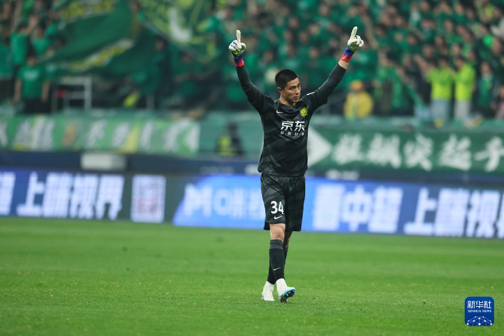 4月5日,北京国安队守门员侯森庆祝球队进球。新华社记者 王楷焱 摄