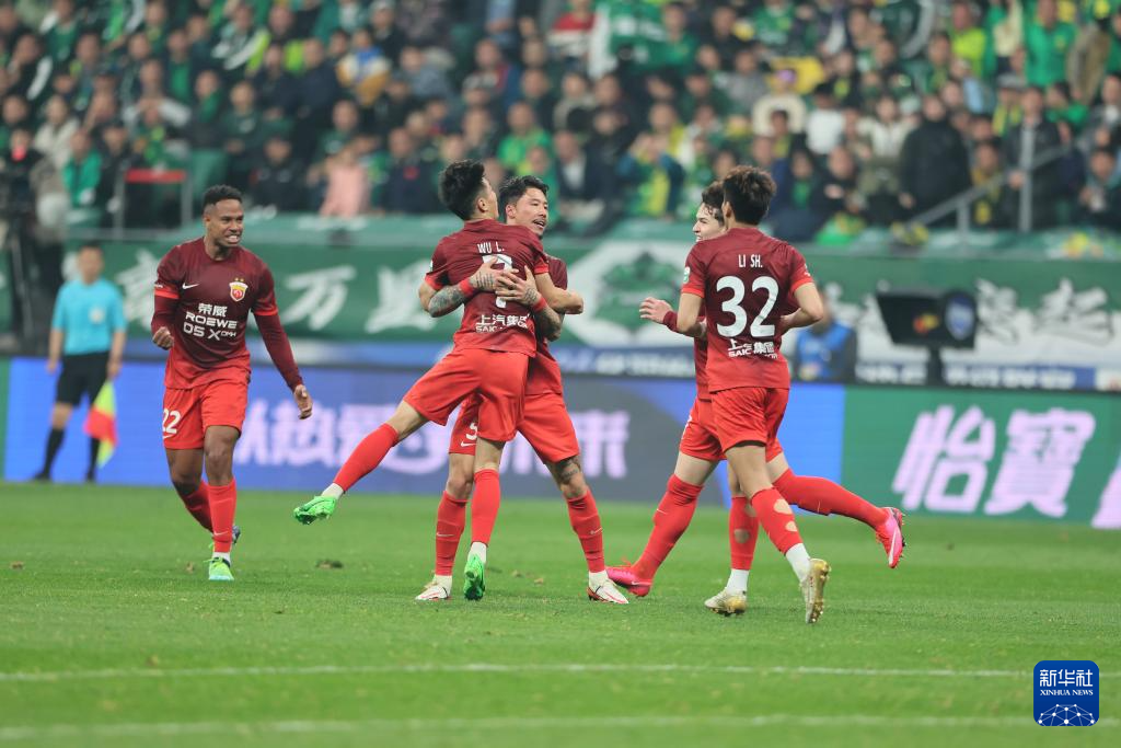4月5日,上海海港队球员武磊(前右二)进球后和队友庆祝。新华社记者 胡星宇 摄