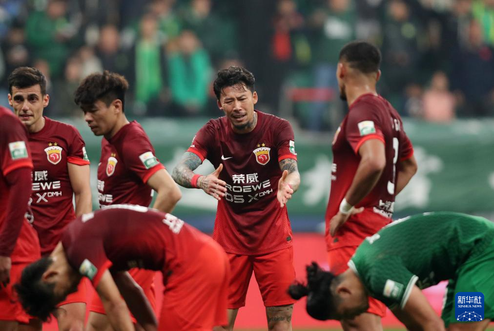4月5日,上海海港队球员武磊(右)在被裁判判罚其因越位助攻队友的进球无效。新华社记者 胡星宇 摄