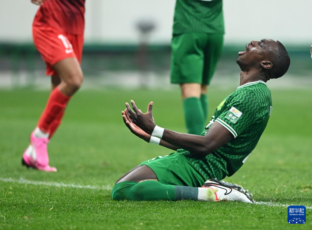 4月5日,北京国安队球员马马杜在上海海港队球员武磊扳平比分后呐喊。新华社记者 赵子硕 摄