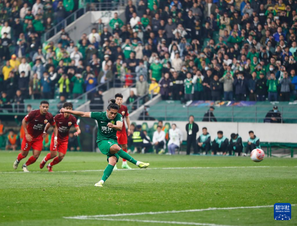 4月5日,北京国安队球员张玉宁(前)在比赛中主罚点球破门。新华社记者 胡星宇 摄