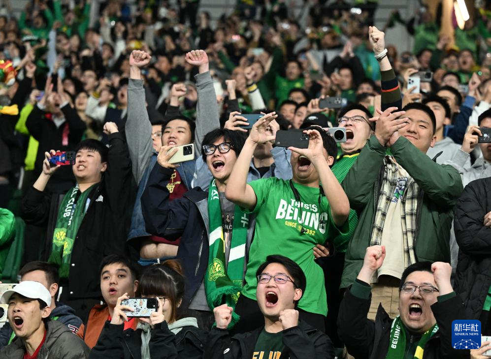4月5日,北京国安队球迷庆祝球队进球。新华社记者 赵子硕 摄