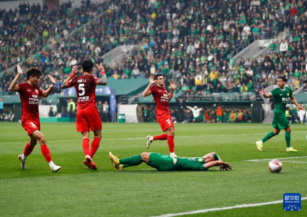4月5日,北京国安队球员方昊(下)在禁区内遭到上海海港队球员张琳芃(左二)犯规后倒地。新华社记者 胡星宇 摄