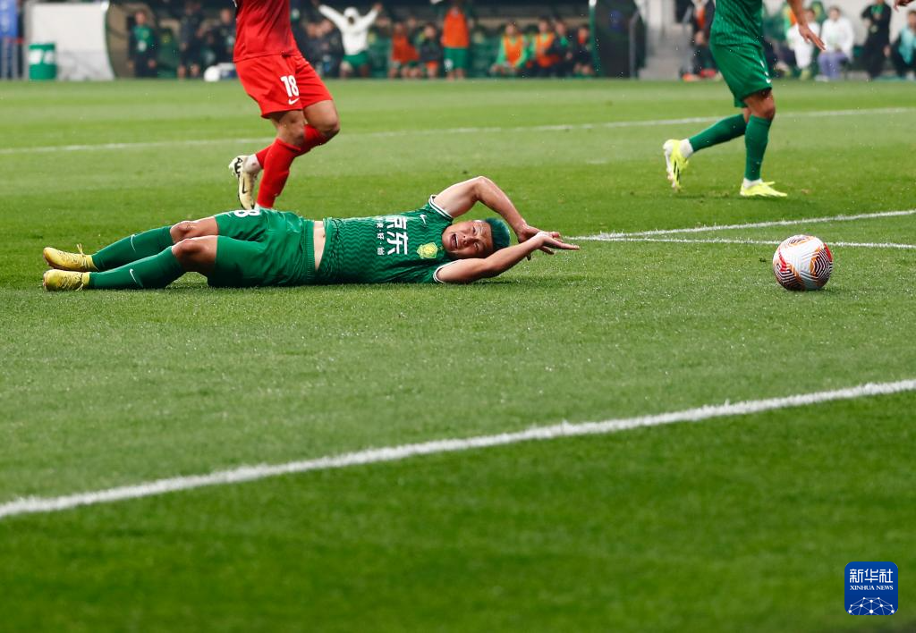4月5日,北京国安队球员方昊在禁区内遭到犯规后倒地。新华社记者 胡星宇 摄