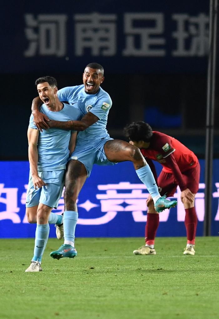 4月5日,深圳新鹏城队球员埃杜·加西亚(左)在比赛中庆祝进球。新华社记者 李嘉南 摄