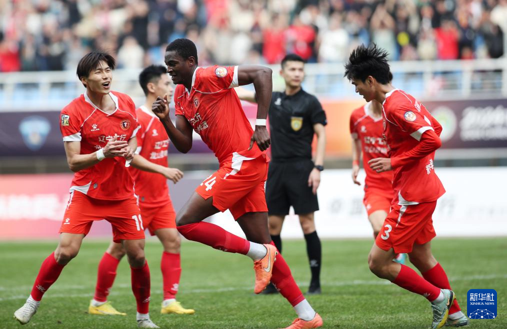4月6日,辽宁铁人队球员惠家康(右三)在比赛中庆祝进球。新华社记者 李钢 摄
