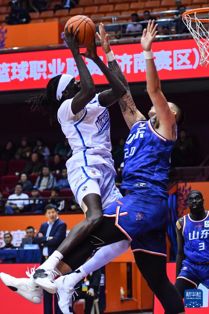 4月6日,山东高速队球员吉伦沃特(右一)在比赛中上篮。新华社记者 朱峥 摄