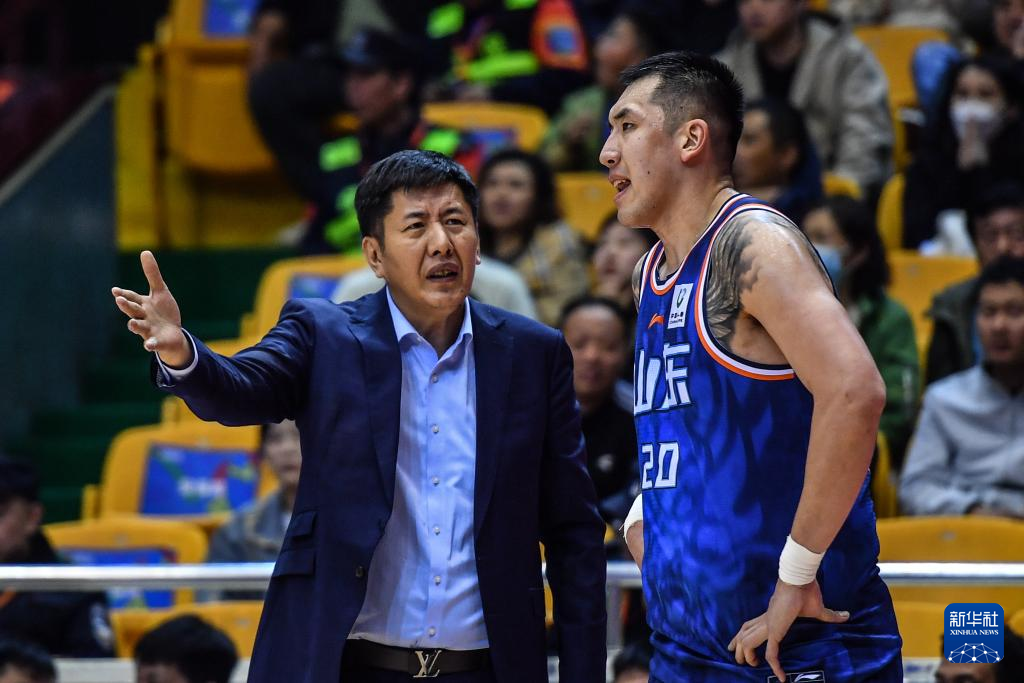 4月6日,山东高速队主教练丁伟(左)在比赛中指导球员陶汉林。新华社记者 朱峥 摄