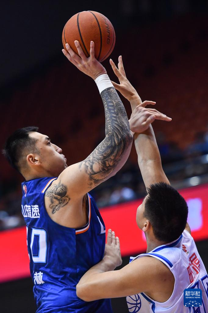 4月6日,山东高速队球员陶汉林(左)在比赛中投篮。新华社记者 朱峥 摄