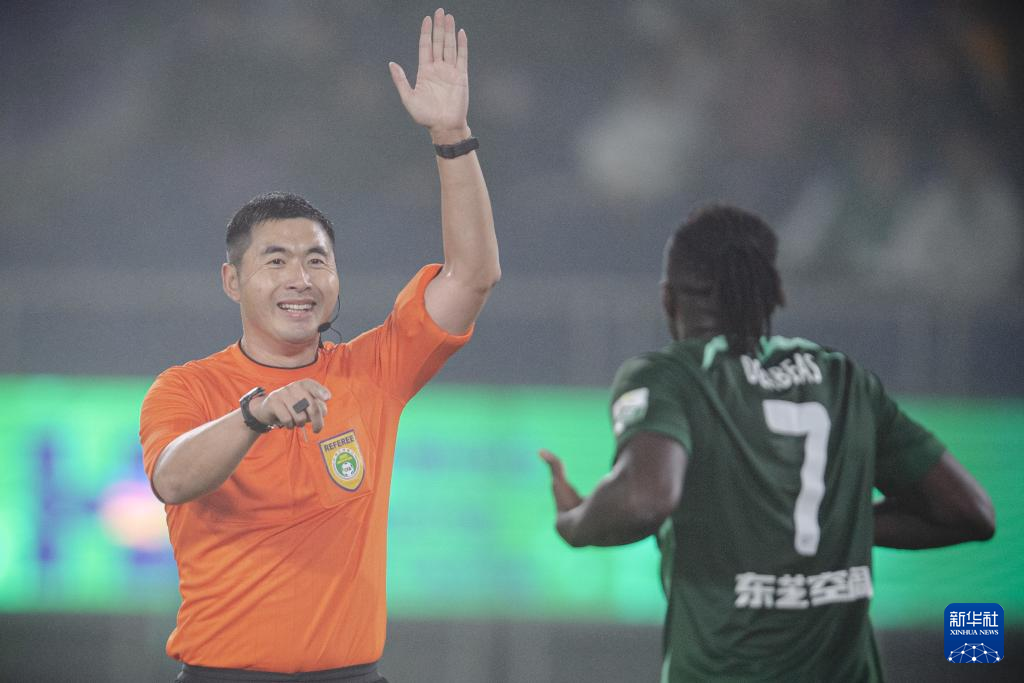 4月6日,主裁判徐强强(左)在比赛中判罚浙江队球员奥乌苏(右)越位在先,进球无效。新华社记者 江汉 摄