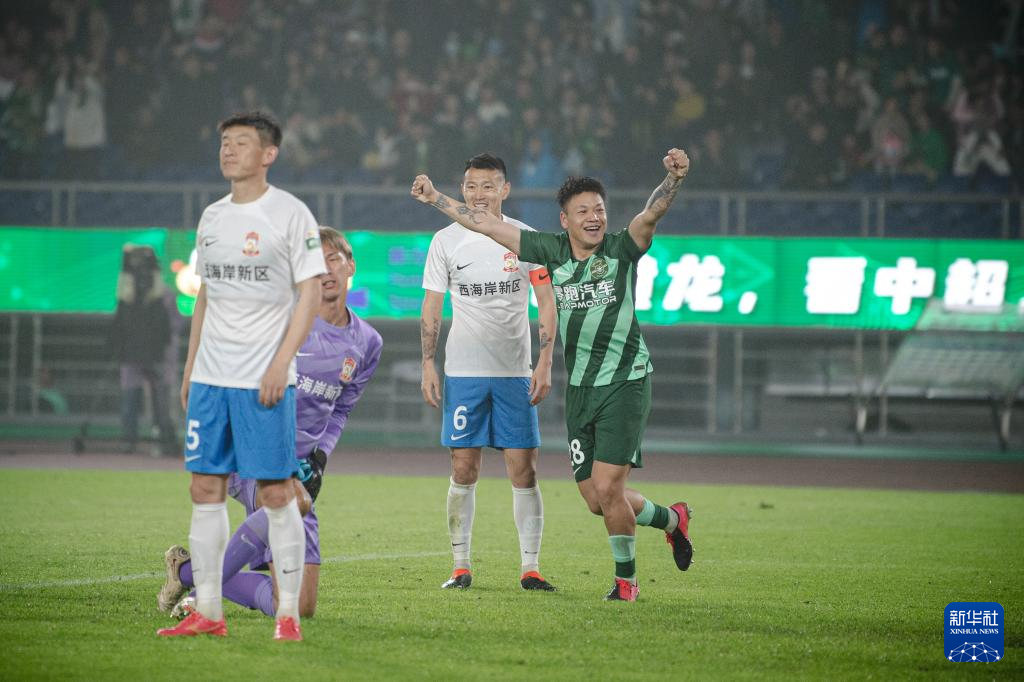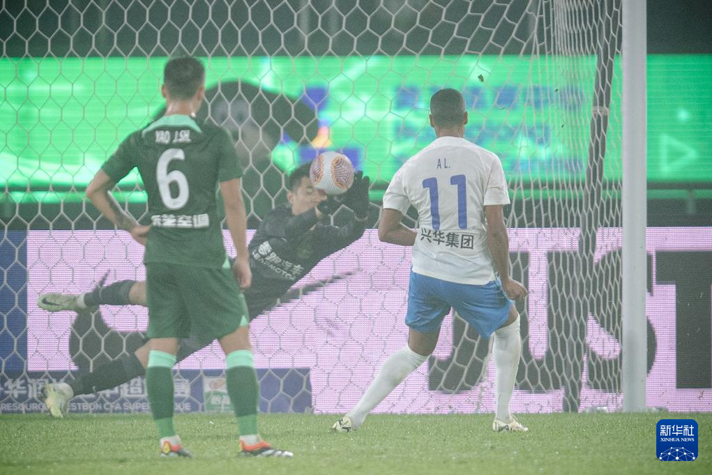 4月6日,浙江队球员奥乌苏(右一)在比赛中射门得分。新华社记者 江汉 摄