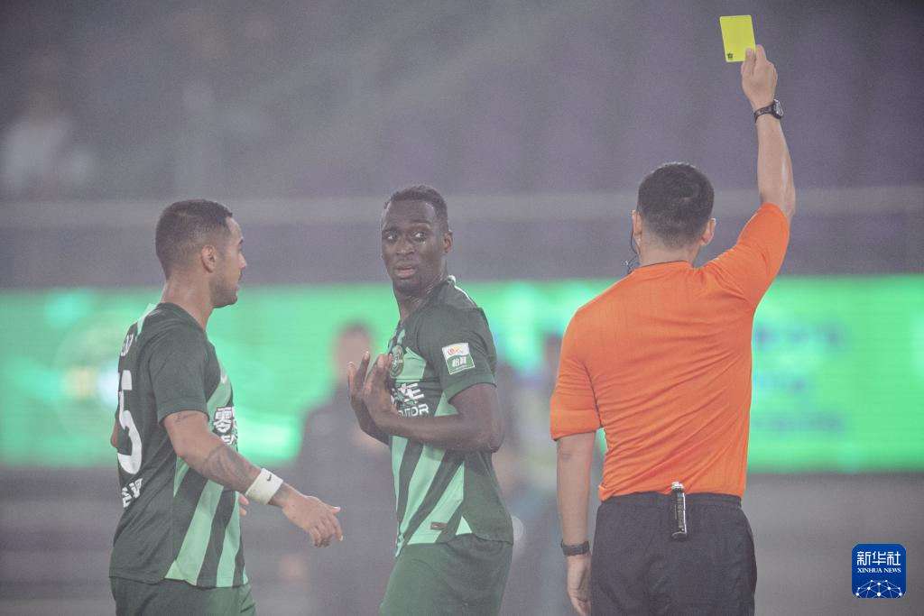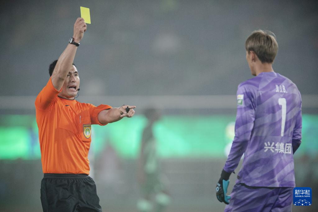 4月6日,主裁判徐强强(左)在比赛中向青岛西海岸队守门员季家葆出示黄牌。新华社记者 江汉 摄