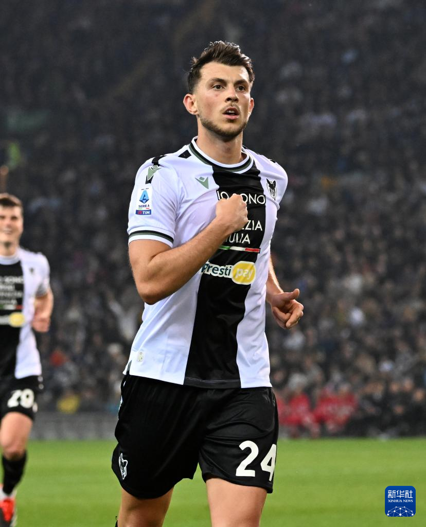 4月8日,乌迪内斯队球员萨马尔季奇庆祝进球。新华社发(迭戈摄)