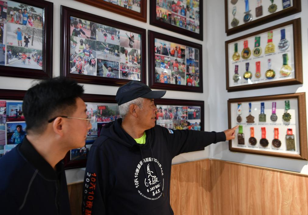2024年1月5日,88岁的跑者郑承端展示他历年来获得的厦门马拉松赛完赛奖牌。新华社记者 魏培全 摄
