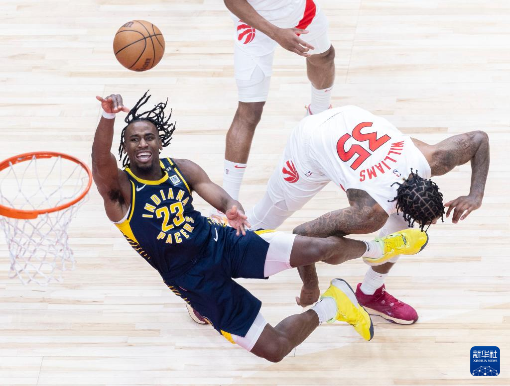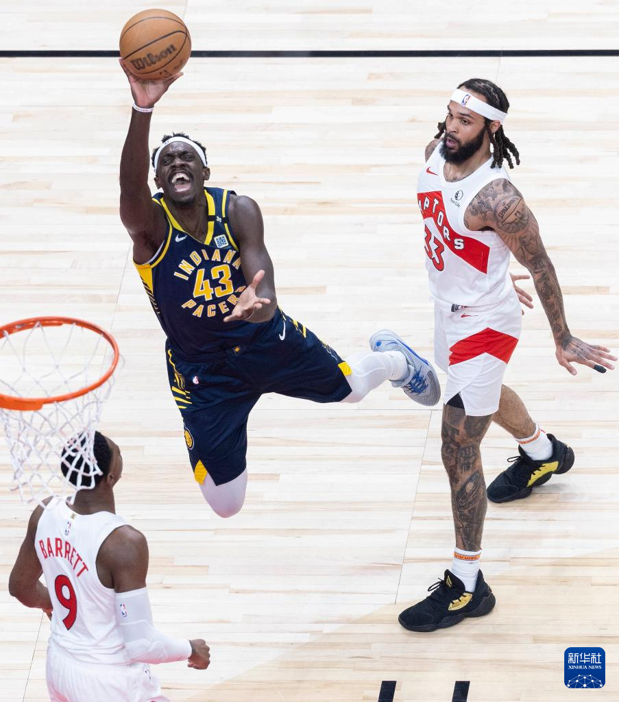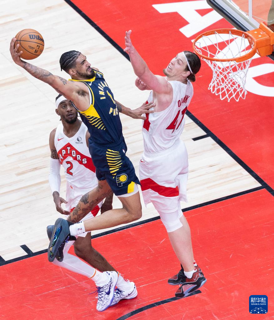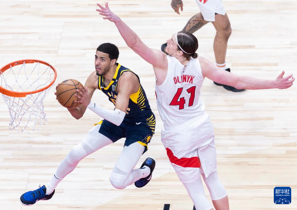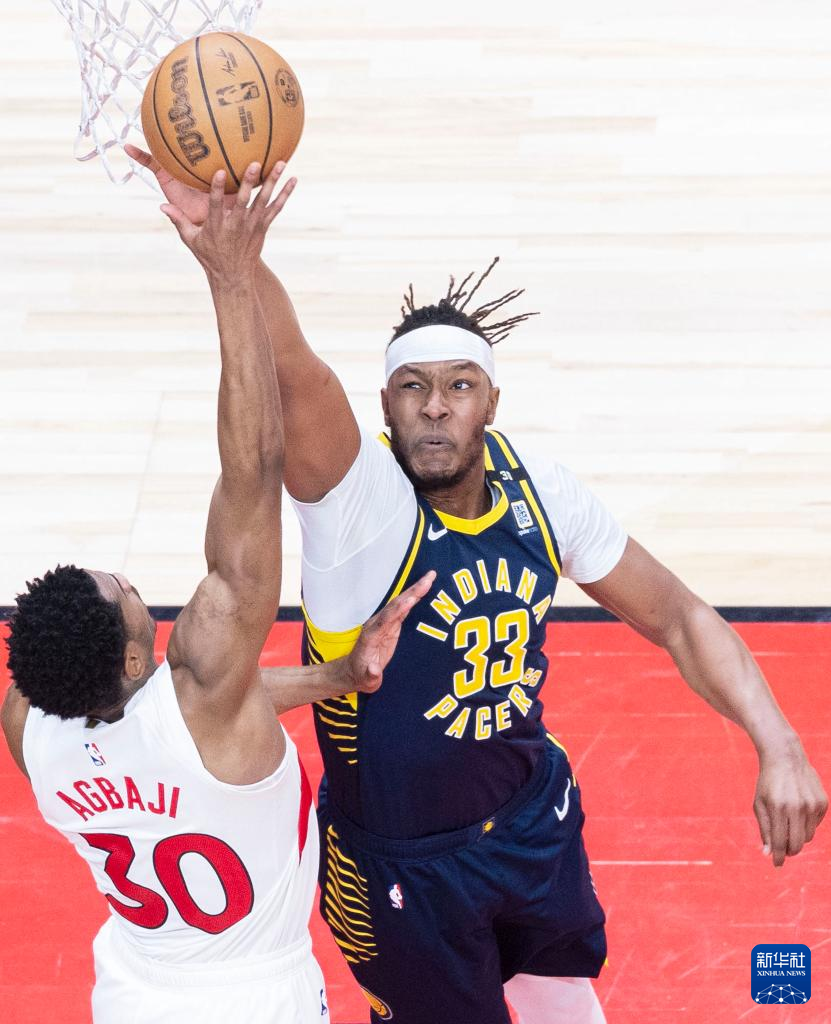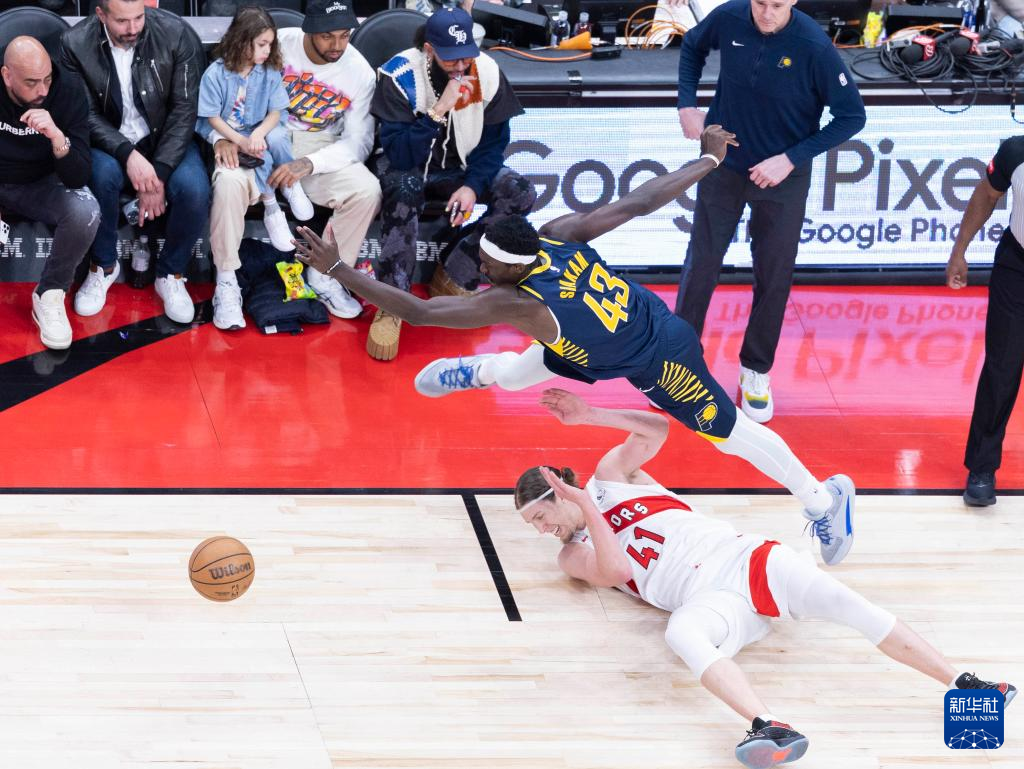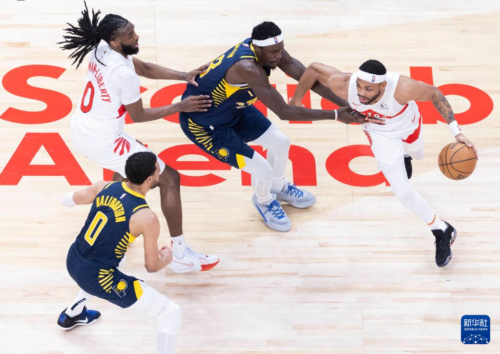 4月9日,步行者队球员西亚卡姆(上)与猛龙队球员奥利尼克在比赛中拼抢。新华社发(邹峥摄)