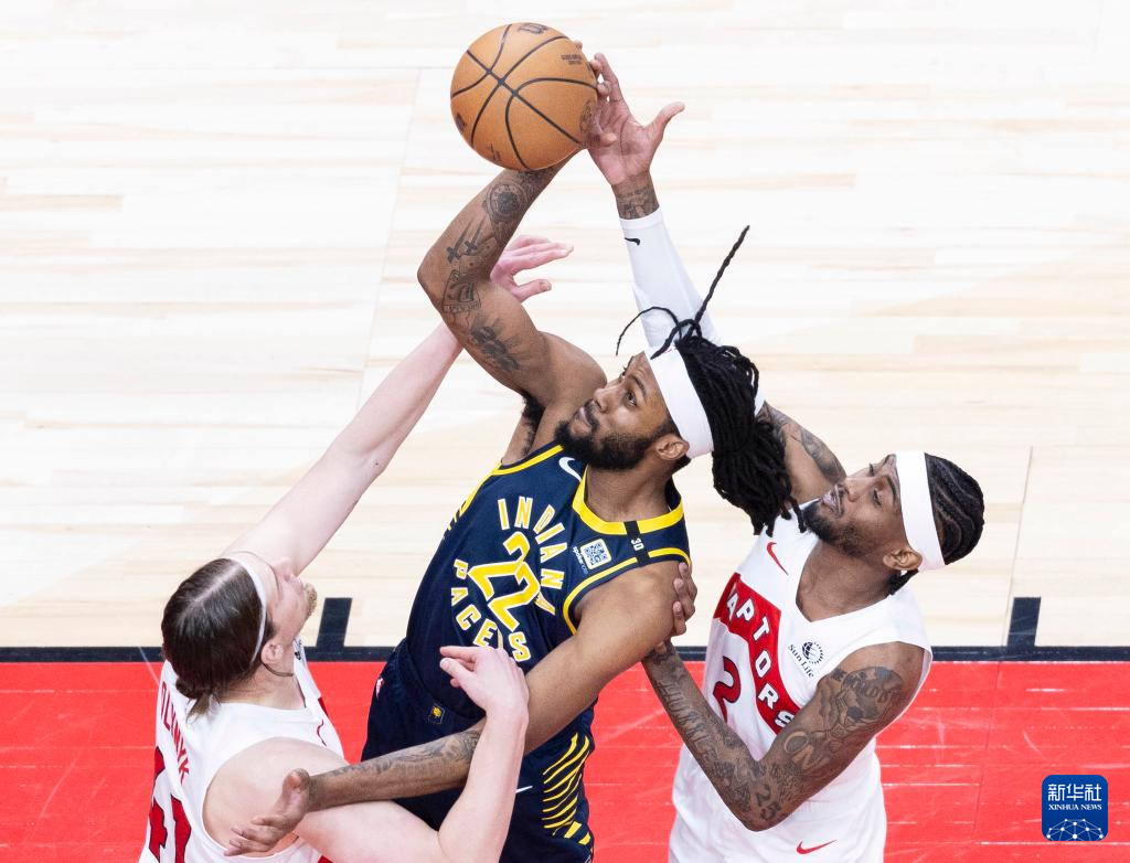 4月9日,步行者队球员杰克逊(中)与猛龙队球员麦克丹尼尔斯(右)、奥利尼克在比赛中争抢篮板球。新华社发(邹峥摄)