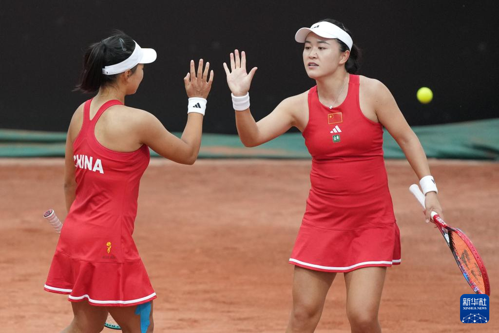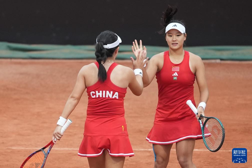 4月9日,中国队组合朱琳/郭涵煜(右)在双打比赛中击掌。她们0比2不敌中国台北队组合詹皓晴/梁恩硕。新华社记者 薛宇舸 摄