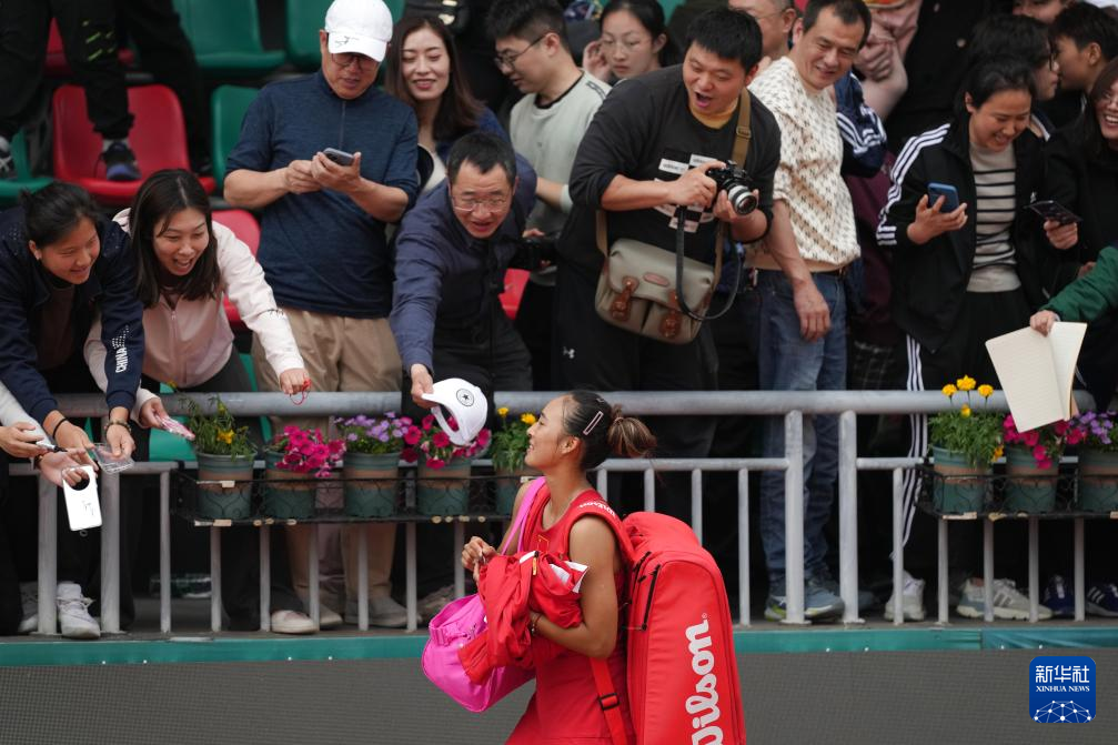 4月9日,中国队选手郑钦文在单打比赛后与观众互动。她2比0战胜中国台北队选手杨亚依。新华社记者 薛宇舸 摄