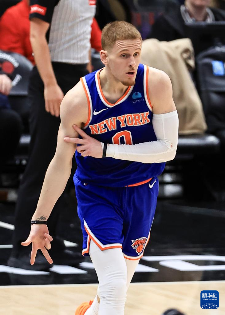 4月9日,尼克斯队球员迪温琴佐在比赛中庆祝投中三分球。新华社发(乔尔·莱纳摄)