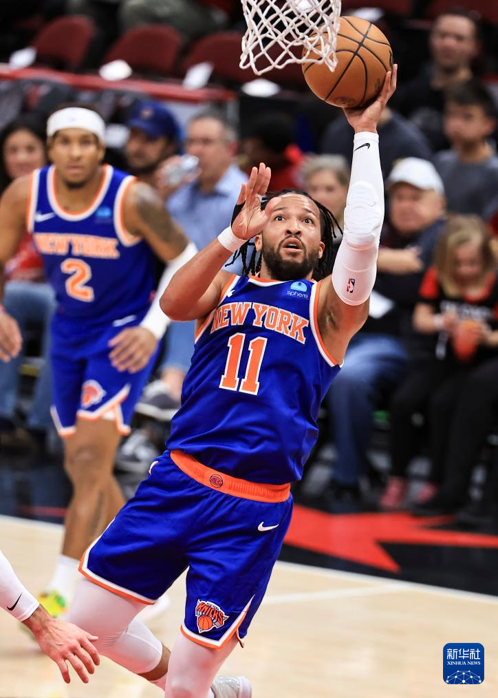 4月9日,尼克斯队球员布伦森在比赛中上篮。新华社发(乔尔·莱纳摄)